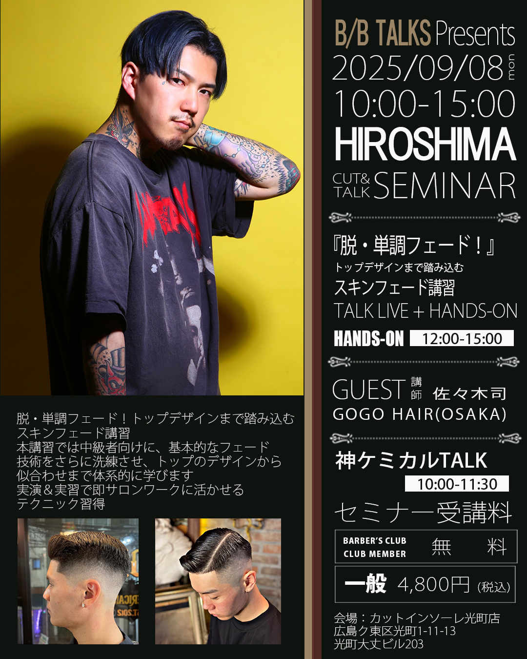 「脱・単調フェード! トップデザインまで踏み込む スキンフェード講習」 本講習では中級者向けに、基本的なフェード技術をさらに洗練させ、トップのデザインから 似合わせまで体系的に学びます 実演&実習で即サロンワークに活かせるテクニック習得